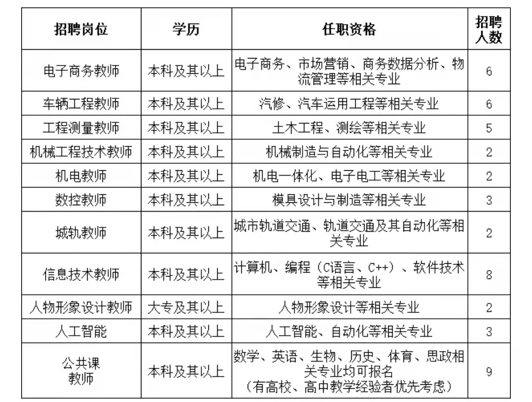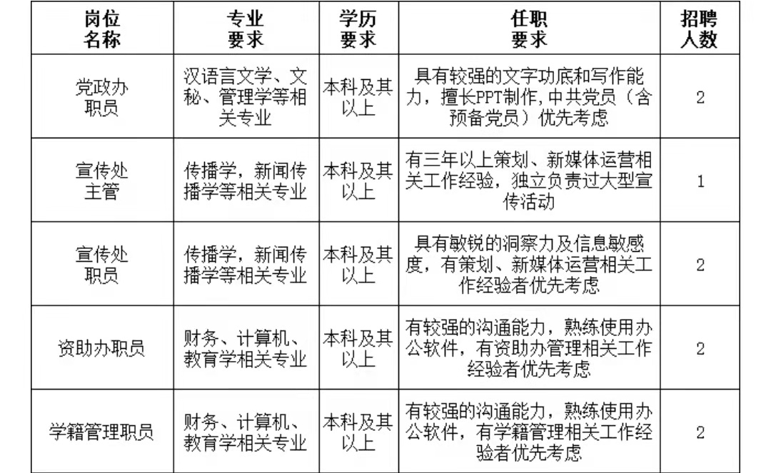 学校现面向社会引进高层次人才、学科带头人,招聘各专业教师和行政岗人员。