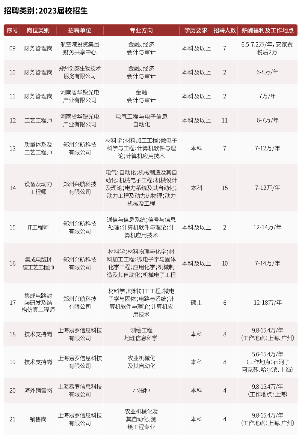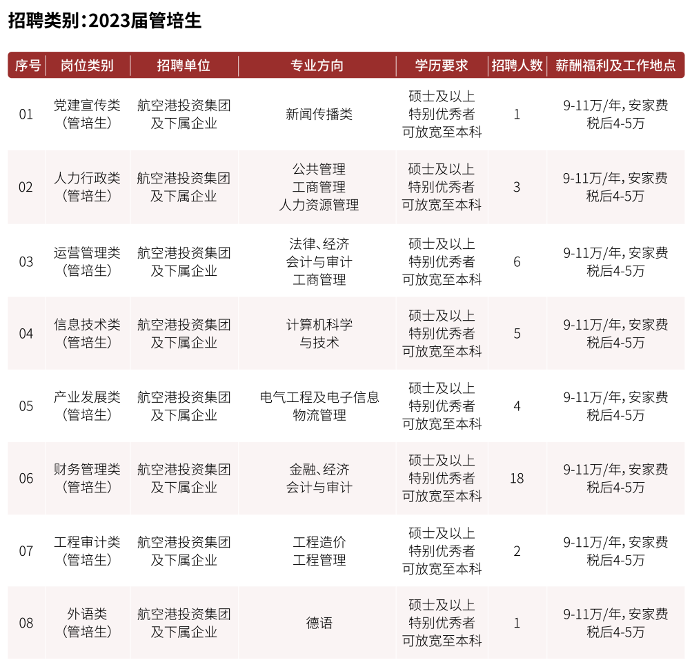航空港投资集团2023届校园招聘对象为2023年应届毕业生(含择业期),管培生优先考虑双一流高校、QS世界排名前200高校毕业生。岗位需求如下: