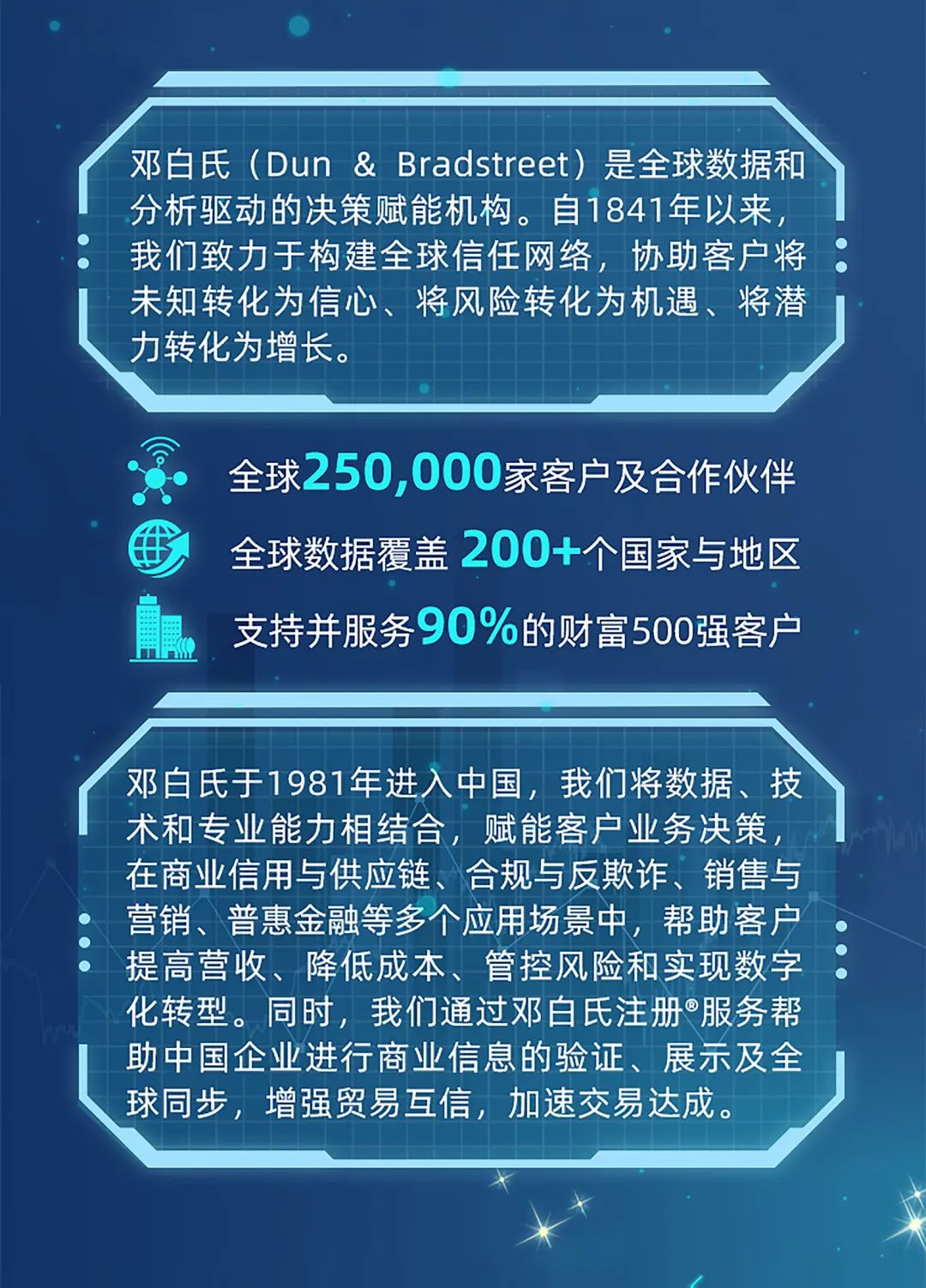 邓白氏(Dun & Bradstreet)是全球数据和分析驱动的决策赋能机构。自1841年以来,我们致力于构建全球信任网络,协助客户将未知转化为信心、将风险转化为机遇、将潜力转化为增长。