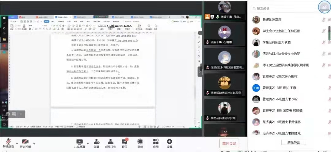 会议伊始,团委干事凡森向参会同学阐述了第二课堂在大学学习生活中的重要意义,并仔细讲解了“pu学时”的必要性。他围绕发起、审核、通过、实行、完成等五个第二课堂活动开展的重要步骤进行宣讲,让在座同学对活动申请有了进一步的了解。同时,凡森强调了班级、社团、学生组织申请活动应归属的范围及标题格式等具体信息。最后,团委委员郑梦飞进行补充说明,对活动简介字数、申请时间、签到方式做出提醒,本次线上宣讲活动落下帷幕。