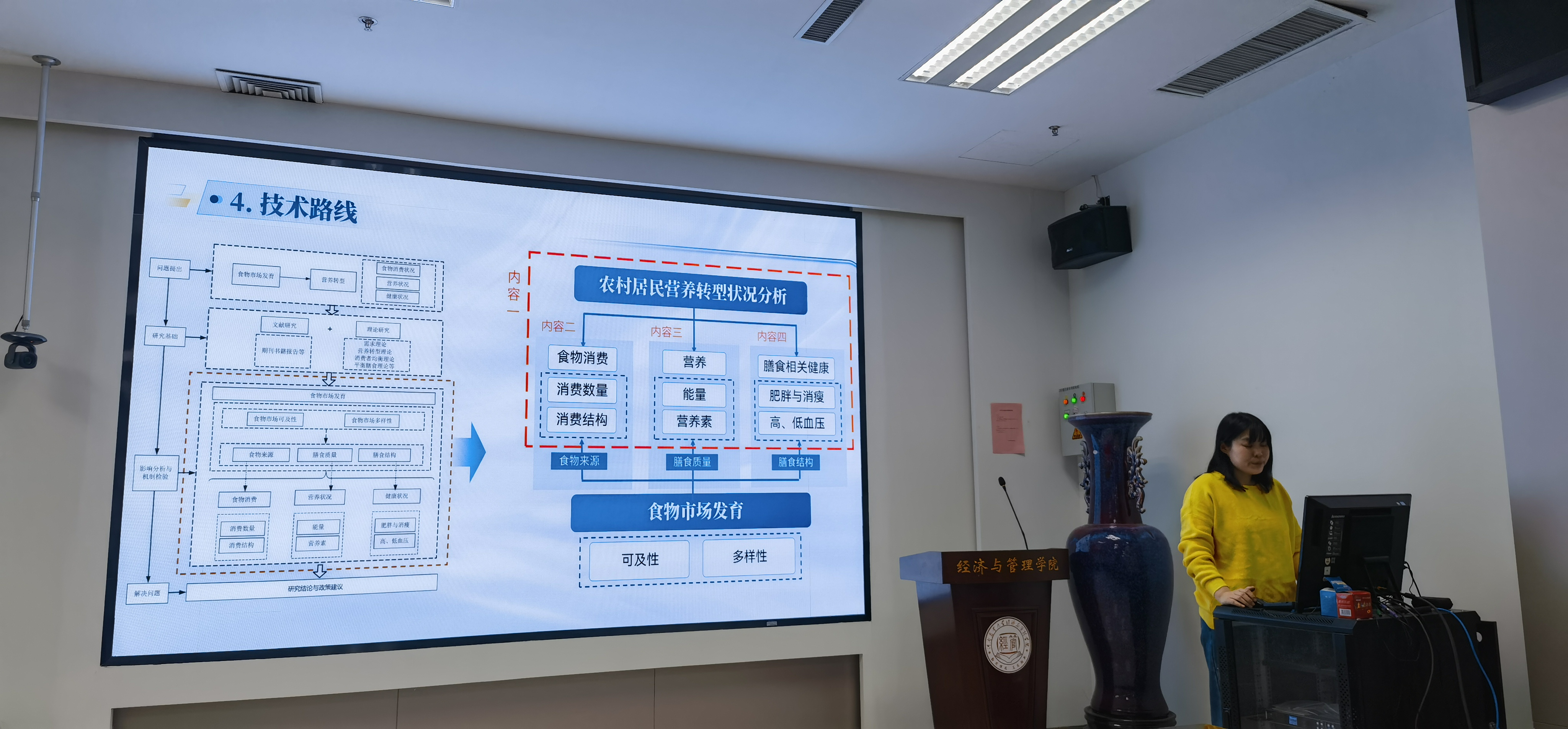 在互动环节,农林经济管理系喻保华副教授从多个角度对该项研究进行深入点评,包括食物消费习惯的时间与空间差异、食物价格的区域间差异、食物获取渠道以及农户农业生产参与程度等。他强调,学术研究应紧密结合实际,致力于解决现实问题。农林经济管理系科研主任张海莹副教授也就食物消费模式发表了自己的看法,并建议研究可以进一步向粮食安全领域延伸。同学们积极发言,就实证计量策略等内容与周莹博士进行了交流讨论。周博士耐心细致地回答了同学们的问题,现场气氛既活跃又融洽。最后,农林经济管理系主任吴强对本次报告进行了简要总结。