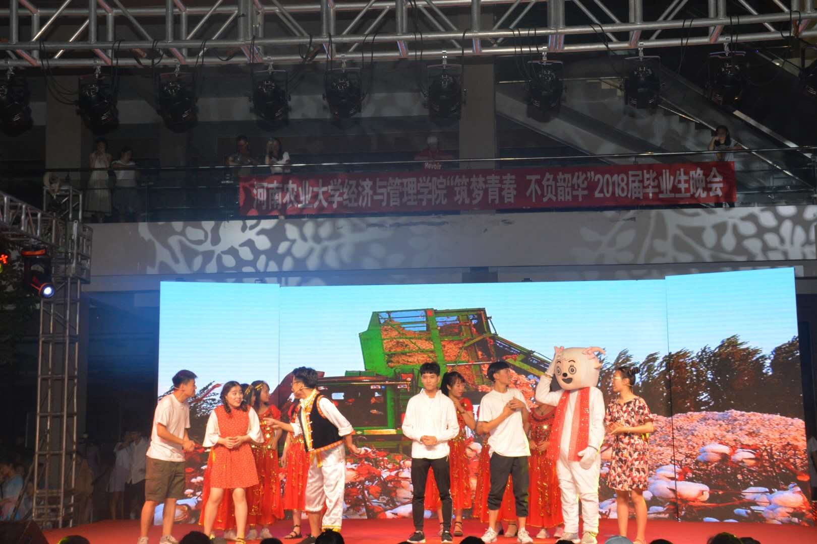 学生的青春活力展现得淋漓尽致,《纸短情长》、《平凡之路》等歌曲唱出了毕业生们对于农大的留恋。诙谐逗趣的相声表演《经管欢乐颂》逗笑了全场,话剧《信守一方》用惟妙惟肖的表演演绎出了农大学子的执着与善良。教师歌曲串烧展现了老师在课堂外多才多艺的一面,《再别经管》向我们展示了师生情深。歌曲联唱表达出了2018届毕业生对于农大老师同学们的不舍之情,《雨碎江南》通过悠扬细腻的器乐声让现场观众如痴如醉。《撑腰》将舞蹈与音乐结合,再次将全场气氛点燃。最后,本次毕业生晚会圆满落幕。