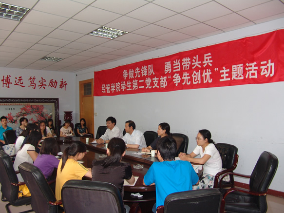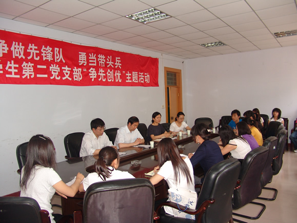 学生第二党支部开展的“争做先锋队,勇当带头兵”创先争优主题活动。程书记在听取了学生党员的发言后,向大家介绍了学校近期发展中的一些大事、喜事,并就“创先争优”活动作了重要讲话。