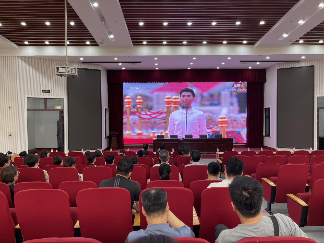 领导班子组织全体教职工在教学楼AB间大教室1集中观看大会直播。