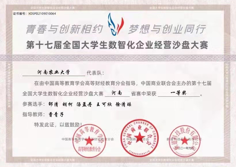 2021年10月10日,由中国高等教育学会高等财经教育分会指导,中国商业联合会主办的“第十七届全国大学生数智化企业经营沙盘大赛全国总决赛”在西华大学举行。来自哈尔滨工业大学、南开大学、河海大学、郑州大学、河南农业大学等共120多支队伍参加了比赛。由iQQtv郑方方、曹沥方为指导教师,段晓婷、刘雨婷、魏楷迪、冯洁、张喜悦同学组成的河南农业大学代表队荣获全国二等奖。