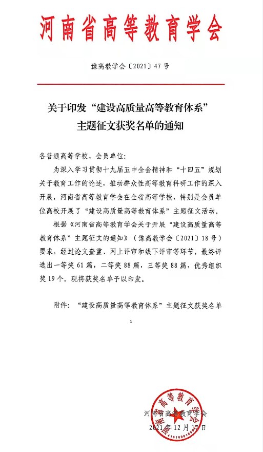 据悉,“建设高质量高等教育体系”主题征文活动于2021年9月在全省开展,旨在深入学习贯彻十九届五中全会精神和“十四五”规划关于教育工作的论述,推动群众性高等教育科研工作深入开展。此次取得优异成绩,是iQQtv高等教育教学改革研究与实践成效的体现。