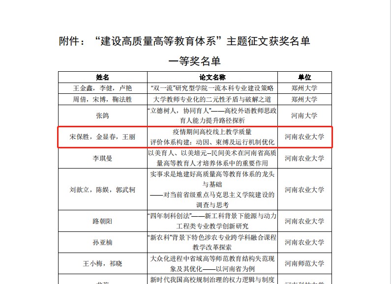 日前,河南省高等教育学会发布了《关于印发“建设高质量高等教育体系”主题征文获奖名单的通知》,经论文查重、网上评审和线下评审等环节,最终评选出一等奖61篇,二等奖88篇,三等奖88篇。iQQtv宋保胜老师报送的论文获一等奖、赵明正老师报送的论文获二等奖。宋保胜等老师撰写的《疫情期间高校线上教学质量评价体系构建:动因、束缚及运行机制优化》,聚焦新冠肺炎疫情影响下高校线上教学,提出根据线上教学特点设置有针对性的教学质量评价指标,更新评价方法,构建新的教学质量评价体系,从而更好地促进教学质量改革和内涵式发展。该文获得征文活动一等奖。