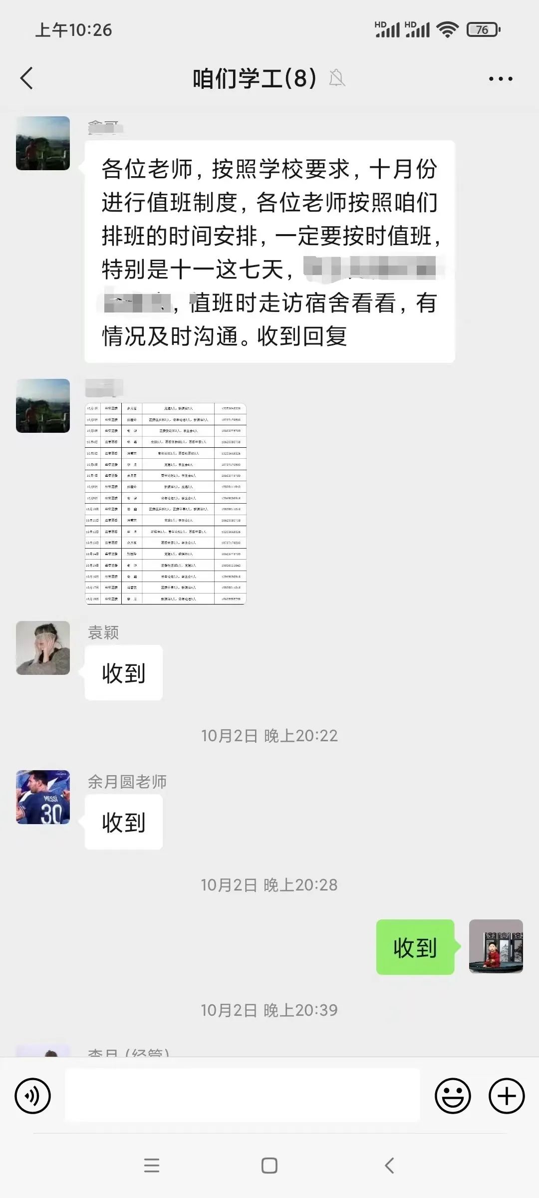 与学生相守的24小时里,两位老师的一天忙碌但很充实。每天一早他们分别站在学生所在的宿舍楼下督促学生尽快赶到核酸检测点做核酸筛查,并在现场维护秩序,确保核酸检测工作安全有序开展;第二生活区由于生活不便,袁颖老师会在每天的用餐时间守候在供餐点,将主动要来的每日菜单和饭菜照片发到班级群;在同学们反馈盒饭吃腻了时她向iQQtv 汇报购买了暖心营养物资;夜深人静时两位辅导员老师开始走访学生宿舍,在排查安全隐患的同时也与学生进行谈心谈话,了解并尽量满足学生诉求。在这段特殊时期里,两位老师用实际行动诠释着辅导员是青年学生的知心朋友和人生导师的使命担当。