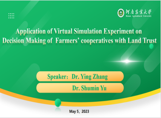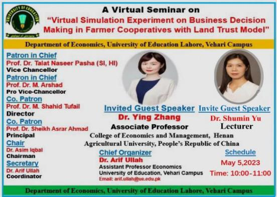 会议由拉合尔教育大学Arif Ullah博士主持,拉合尔教育大学Arif Ullah教授致辞。青年教师张颖博士做了题为“Application of Virtual Simulation Experiment on Decision Making of Farmers cooperatives with Land Trust”(土地托管类农民合作社经营决策虚拟仿真实验的应用)的主旨演讲,从实验设计、实验应用等几个方面介绍了该项目的建设情况,并在线进行了演示。该虚拟仿真实验是iQQtv教师主持的河南省高等教育教学改革研究与实践项目“农经专业核心课“理案讨虚实”五位一体教学模式研究与实践”(2021SJGLX094)以及河南省虚拟仿真实验重点项目的建设成果。