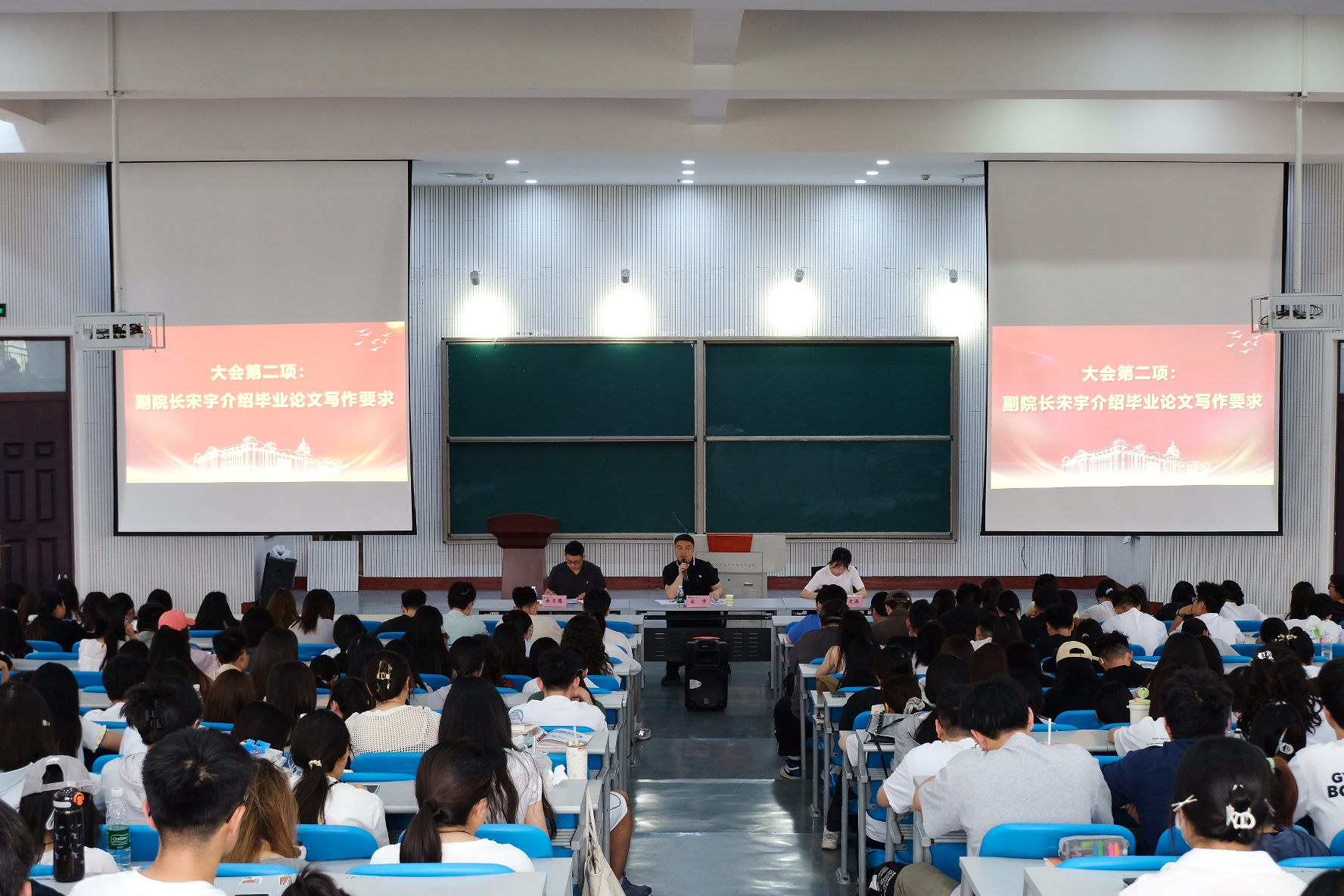 会议在庄严的国歌合唱中拉开帷幕。首先,宋宇对毕业论文写作要求进行指导,就答辩新的要求进行说明,着重提醒同学们要重视答辩环节。同时,他还指出了当前部分论文撰写存在的问题。随后,黄文源围绕毕业审核、毕业答辩两项工作进行说明,强调“线上”毕设系统与“线下”教务归档相结合,督促大家尽快完成“双选”工作,及时查重保证论文质量,此外,她特别叮嘱同学们要密切关注班级群消息,强化“自我负责”意识,确保毕业相关事务顺利推进。