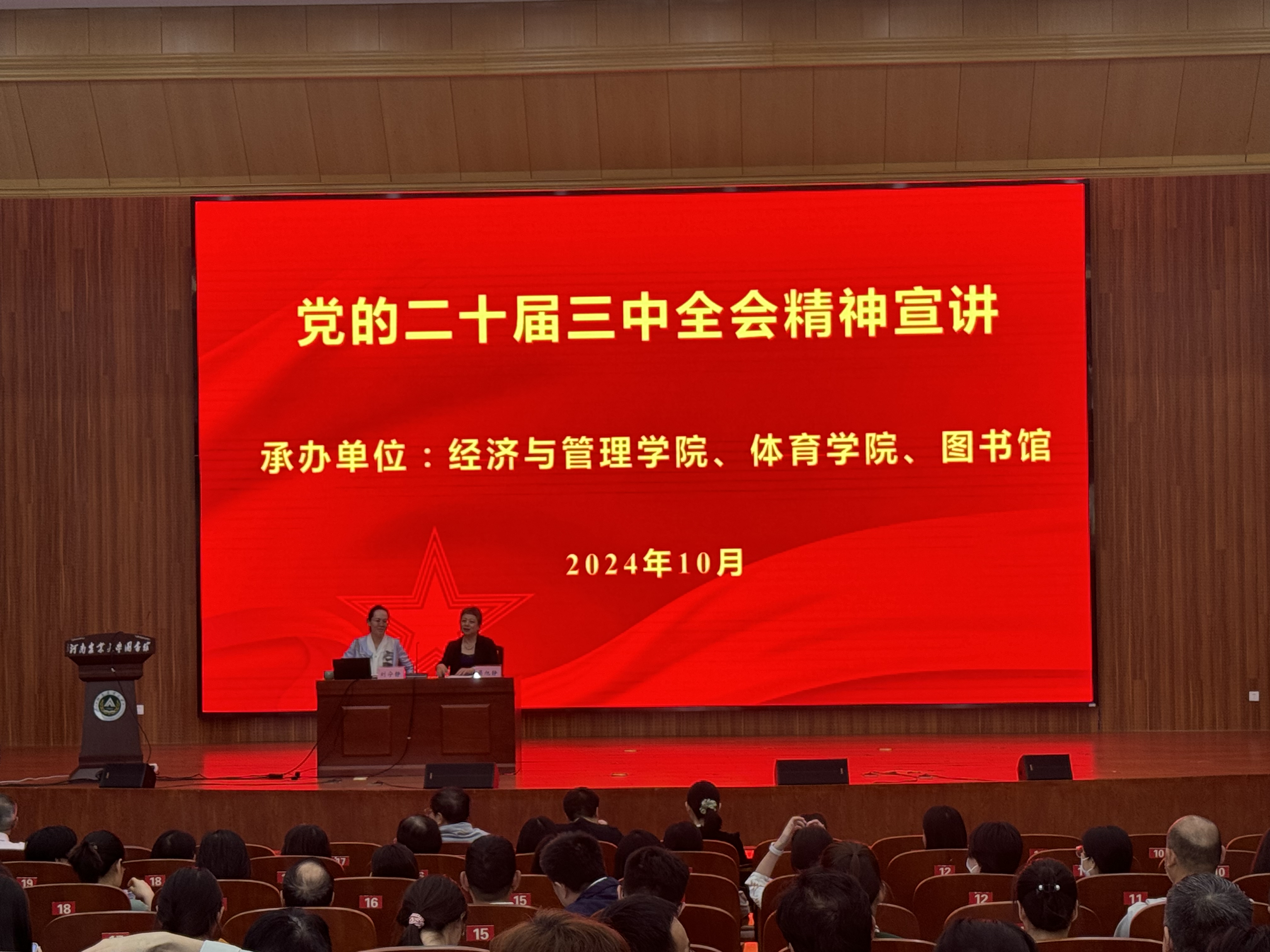 、体育学院、图书馆联合举办党的二十届三中全会精神专题宣讲大会。此次宣讲会由体育学院党委书记吴旭静主持,特邀河南省高校思想政治理论课教指委委员、河南农业大学马克思主义学院刘宁静作为主讲人,承办单位全体教职工和学生代表到场参加。