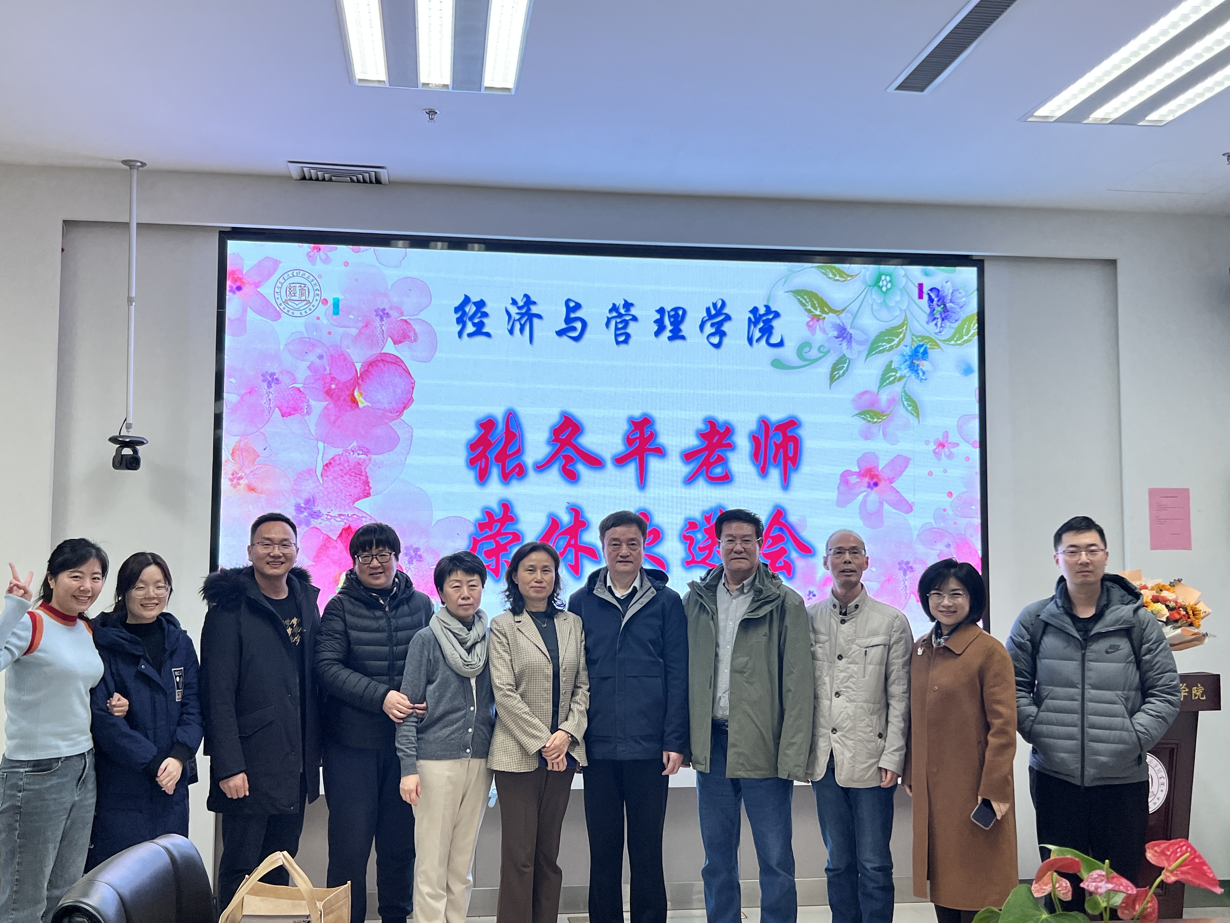 伴随着热烈的掌声,院长马恒运为张冬平老师颁发了荣休纪念杯,院工会常务副主席张锋老师献上鲜花表达感谢与祝福。
