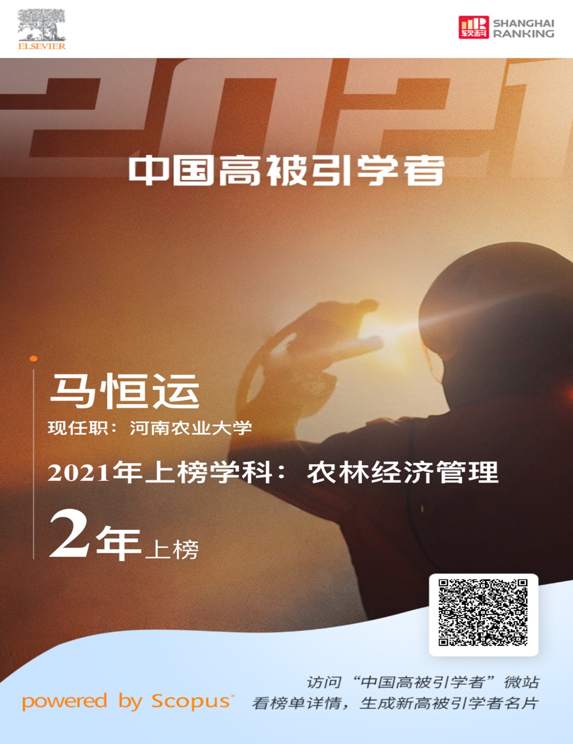 院长马恒运教授继入选2020年该领域榜单后再次入选。