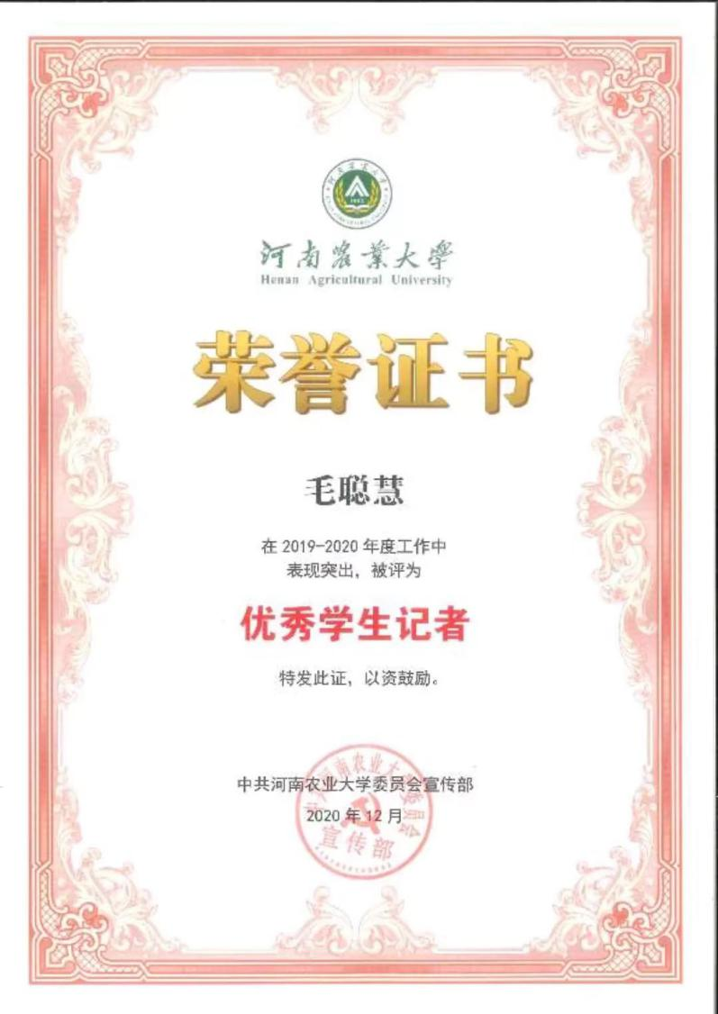 任职团支书期间,毛聪慧曾带领班级入党积极分子积极参与“五爱工程”建设,去到郑州市金水东路帮助执勤交警站岗,指挥路况,受到郑州市第六交警大队表彰。所在宿舍全员获国家励志奖学金,所带班级荣获校学风建设先进班级。除此之外,她在大一期间就带领班级同学获院“新生辩论赛”第二名,后来还带领他们积极参加学院举行的集体舞,红歌会等大型文艺活动,连续两年都进入了决赛并取得了较好的名次。作为一名团学干部,她带领班级同学去二七纪念馆了解郑州工人的革命历史。她也经常在班级内开展团日活动,帮助同学们了解我们党的最新时事和动态,通过代表发言,视频播放,舞台剧的形式将团日活动主题班会搞得绘声绘色,深受大家好评。任职记者团主任期间,她独立在校报发表文章两篇,负责组织协调记者团内部事务,联动推进校新媒体等六部门的日常工作。先后组织策划多次“元旦茶话会”“表彰大会”等大型校内外学生记者联谊活动,参加人数合计达到2000人。并获得“校优秀学生记者“荣誉称号。