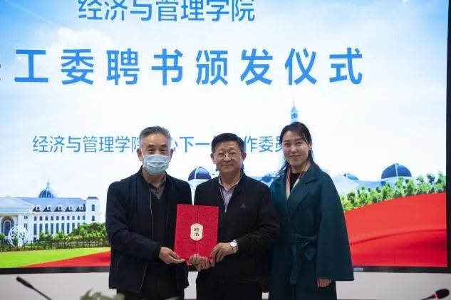 戴强老师为关工委委员,王宾齐为其颁发聘书并合影留念,并共同表示将会坚持立德树人的正确方向,团结教育下一代听党话、跟党走,支持和帮助青年师生成长、成才。