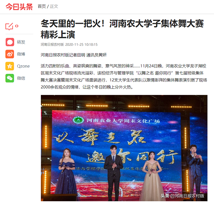 第七届“以舞之名,邀你同行”班级集体舞决赛于龙子湖校区一餐广场如期举行。此次活动的顺利举办,除了院内师生的积极参与外,更离不开学校以及社会媒体对该活动的大力支持。