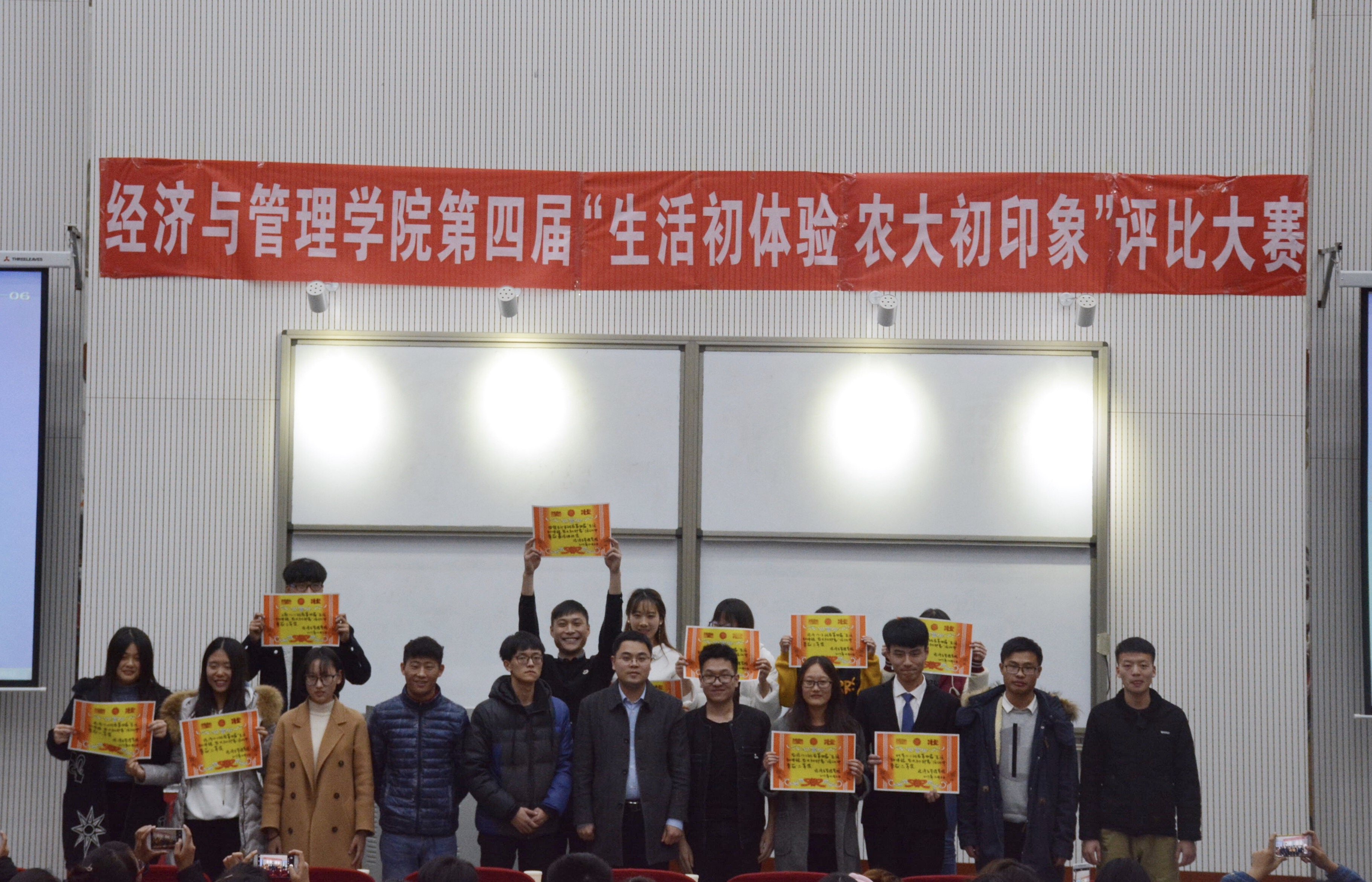 在主持人精彩的开场白中,此次活动正式拉开了帷幕。首先,22个参赛班级按照赛前抽签顺序依次上台展示。各班参赛者通过制作精美的PPT和精彩的解说,围绕校园风景、军训生活、新生系列活动等方面为我们展示了他们的农大初印象,也把对未来的憧憬与期待娓娓道来。精彩的展示引起了同学们的共鸣,现场观众认真听讲,气氛活跃。接着,新媒体工作室播放了自制的关于活动主题的视频,将现场气氛又一次推向高潮。最后,综合现场评委打分和微博得分,经济17-2班荣获一等奖,农经17-1班、财管17-1班、经济17-1班荣获二等奖,经济17-5班、经济17-3班、营销17-1班、工商17-1班、国贸17-1班荣获三等奖,国贸专升本荣获最佳组织奖。伴随同学们热烈的掌声,此次评比大赛圆满落下了帷幕。