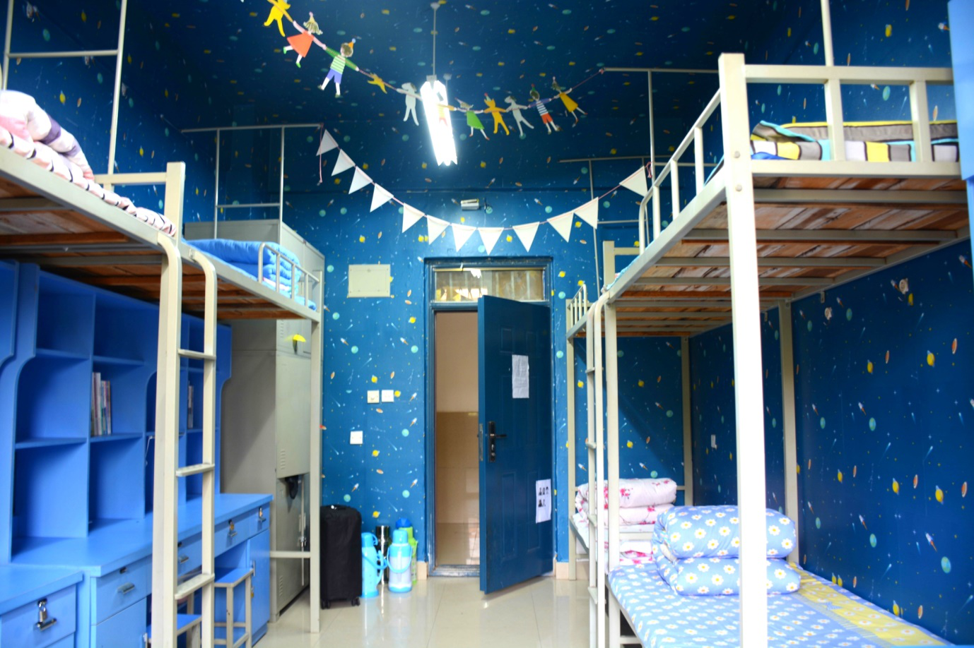 在宿舍装扮大赛开始之前,各位同学集思广益,积极构想宿舍文化主题、购置宿舍装饰材料,发扬团结协作的精神,积极准备宿舍装扮工作。同学们以不同的主题、风格和个性装饰,从宿舍舍名及励志语、安全标语及宿舍卫生等方面着手装扮,展示寝室的风采。同学们用自己的奇思妙想与无限创意营造了整洁舒适、温馨雅致的寝室环境,将良好的宿舍文化氛围与积极向上的精神面貌体现得淋漓尽致。老师们对同学们独具匠心的创意装扮产生了极大兴趣,与同学们进行了亲切的交流。最后,各位老师和学生会干事们对各个宿舍的装扮进行了了公平、公正的评分,本次宿舍装扮大赛圆满落下帷幕。