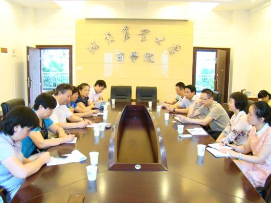 在随后的座谈会上,吴一平院长首先介绍了我系出席座谈会的老师、本次考察的目的,以及学院发展概况。湖南农业大学经济学院李明贤院长与商学院兰勇院长分别介绍了学院发展历史、科研团队建设、核心课程建设、实验室建设、研究生招生等情况。双方还就国家基金项目申报、院系两级管理、科研激励等方面进行了深入交谈。会谈结束后,农林管理系一行还参观了两院的教师办公室、资料室、实验室。
